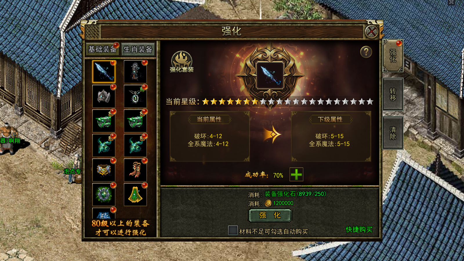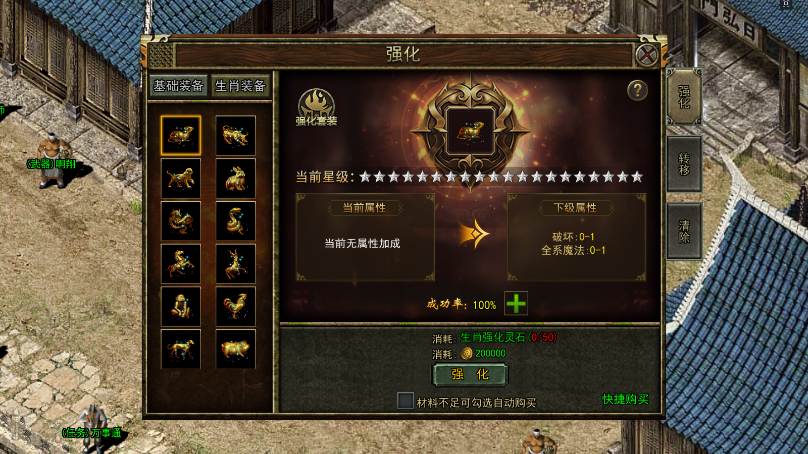 开服48天开启,可将基础装备和生肖装备进行强化,基础装备的强化属性保留在装备上,生肖装备的强化属性保留在部位上。