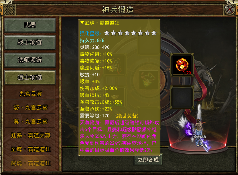 开服190天,新增三职业「武魂·绝世项链」,具体合成材料可在NPC"四字铁匠"处点击查看。